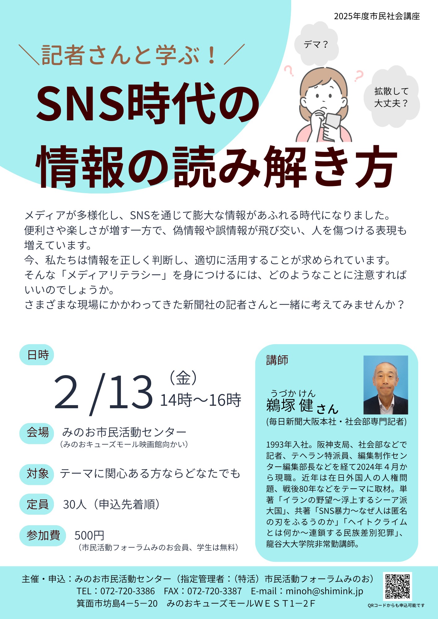 ♠ お 知 ら せ ♠ ◆ 参加申込受付中 ◆ 「SNS時代の情報の読み解き方講座」 ![]() ⇒チラシを拡大(JPEG) 〈日 時〉2月13日(金) 14:00〜16:00 〈会 場〉みのお市民活動センター ◆ ◆ ◆ ◆ ◆ 掲載団体募集 ◆ 『みのお活動グループガイド2026』 上記冊子への掲載団体を募集します (2026年3月発行予定) 〈対象〉市内で公益的な活動を行う非営利の市民活動団体 →詳しくはM-linkページ(別サイト)をご覧ください ・『みのお市民活動グループガイド2026』 掲載団体募集(M-link) |